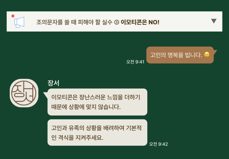조의 문자를 보낼 때에는 기본적인 격식을 갖춰야 해요. 특히 이모티콘을 쓰는 건 슬픔을 겪고 있는 유족에 대한 배려가 아니겠지요. 고인과 유족의 상황을 고려해, 기본적인 격식은 갖춰주세요.
