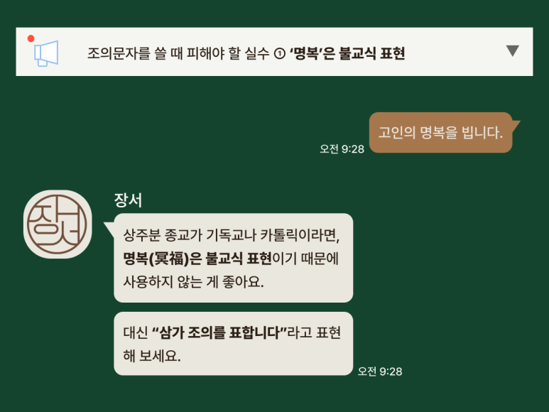 부고의 말을 전할 때 많이 사용하는 명복(冥福)은 사실 불교식 표현이에요. 고인이나 상주의 종교가 기독교이나 가톨릭이라면 사용하지 않는 것이 좋습니다. 대신 "삼가 조의를 표합니다."라고 문자를 보내면 좋아요.